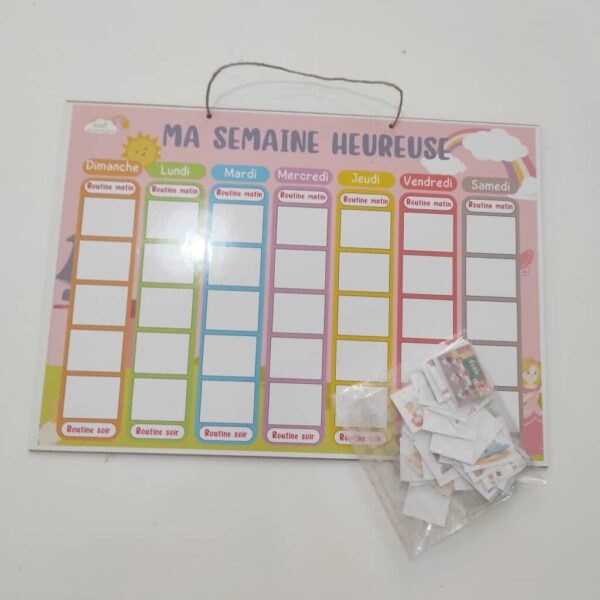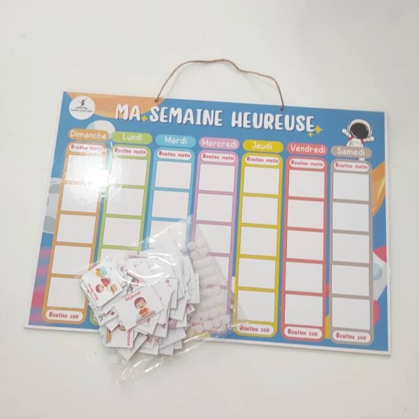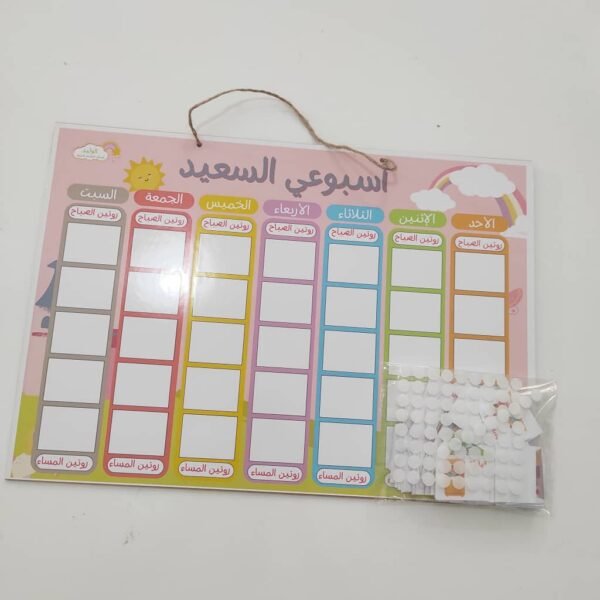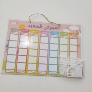 اختر الخياراتلوحة أسبوعي السعيد عبارة عن لوحة خشبية قياسها 30/42سم تتكون من 99 بطاقة مغلفة حراريا منها الخاصة بالموسم الدراسي و منها الخاصة بالعطلة عبارة عن بلانر مبسط للطفل يساعده على تعلم تنظيم وقته من خلال وضع برنامجه الاسبوعي
