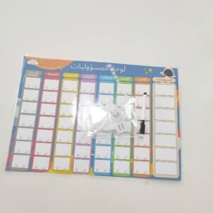 اختر الخياراتلوحة المسؤوليات لوحة ورقية مغلفة حراريا قياسها 30/42 سم تتكون من 18 بطاقة فيها مختلف المسؤوليات الخاصة بالطفل من أجل تعزيز العلاقات وتعليمه حب التعاون و المسؤولية منذ الصغر